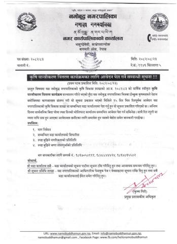 कृषि यान्त्रीकरण वितरण कार्यक्रमका लागि आवेदन पेश गर्ने सम्बन्धी नमोबुद्ध नगरपालिकाको जरुरी सूचना !!!