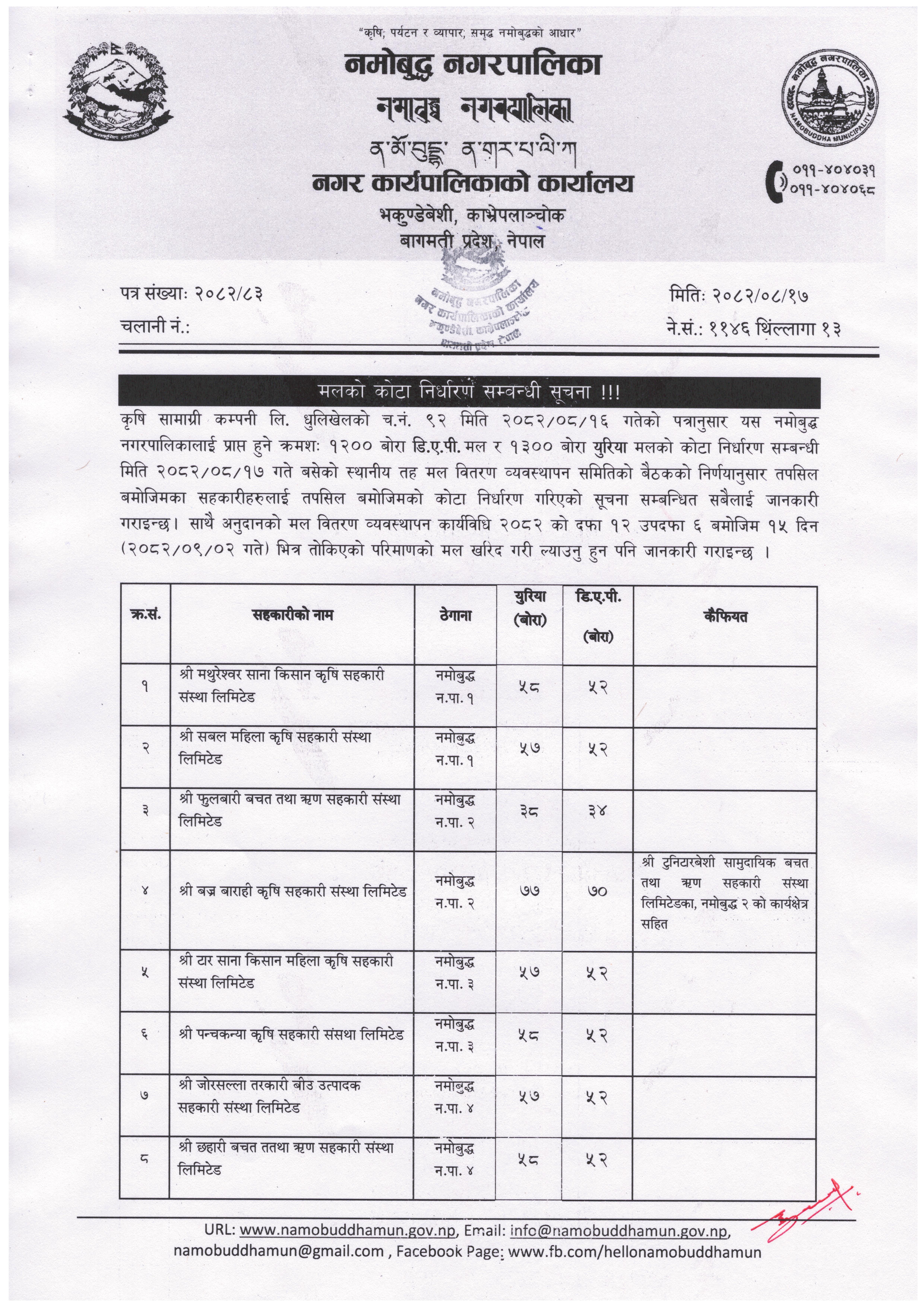 मलको कोटा निर्धारण सम्वन्धी नमोबुद्ध नगरपालिकाको सूचना !!!