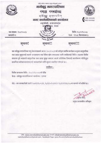 आ.व. २०८२/०८३ को स्वीकृत वार्षिक कार्यक्रम अनुसार सामुदायिक तथा छाडा कुकुरहरूको स्थायी बन्ध्याकरण तथा रेबिज खोप शिविर तपसिल बमोजिम मिति र स्थानमा सञ्चालन गरिने भएकाले कुकुर समाउन आउने प्राविधिक टिमलाई आवश्यक सहजीकरण गरिदिनुहुन सम्बन्धित सबै सरोकारवालाहरूमा जानकारी गराइन्छ ।