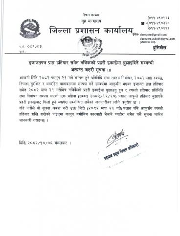 इजाजतपत्र प्राप्त हतियार समेत नजिकको प्रहरी इकाईमा बुझाइदिने सम्बन्धी अत्यन्त जरुरी सूचना !!!