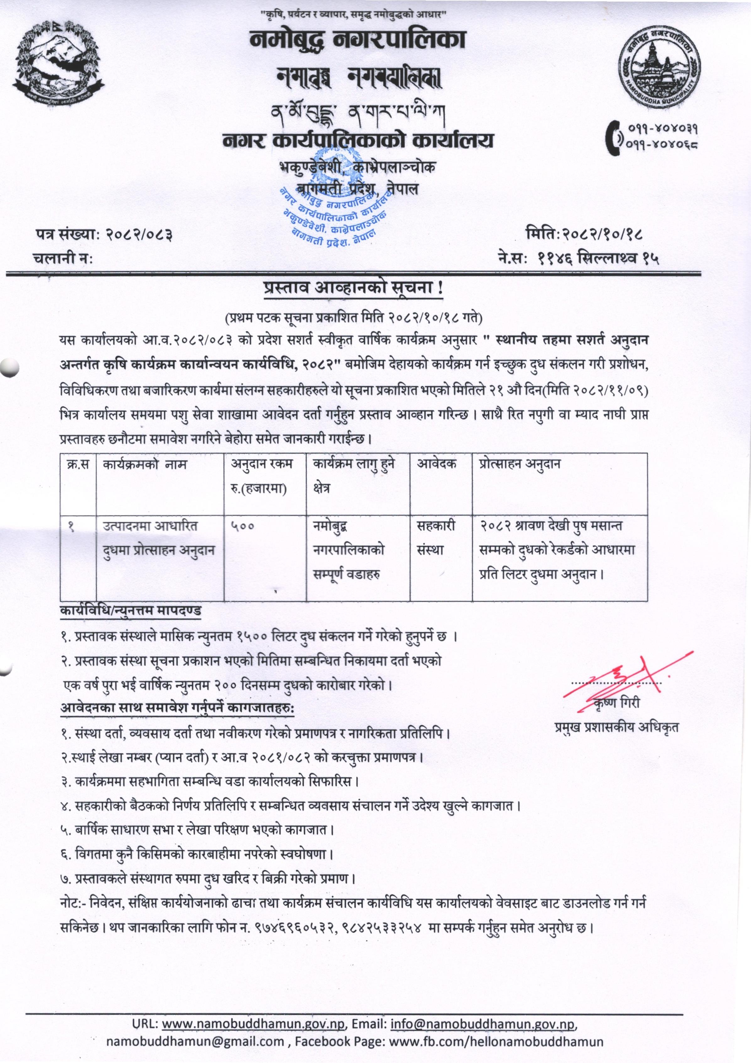 दुग्ध उत्पादनमा आधारित प्रोत्साहन अनुदानका लागि प्रस्ताव आव्हान सम्बन्धी सूचना