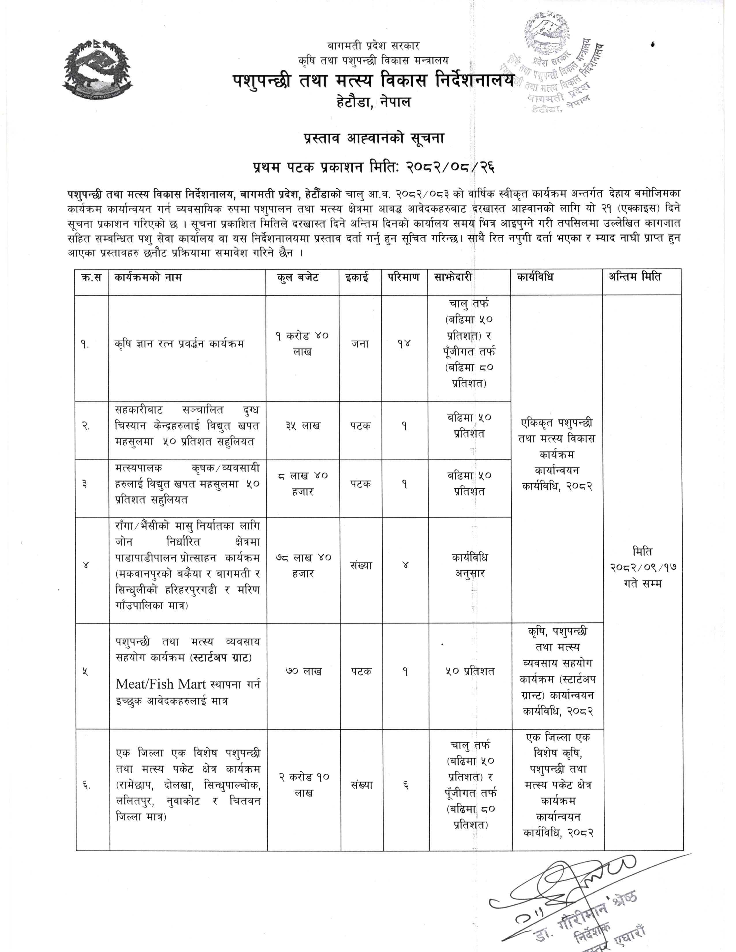 पशुपन्छी तथा मत्स्य विकास निर्देशनालय हेटौडा, नेपालद्वारा प्रस्ताव आव्हानको सूचना !