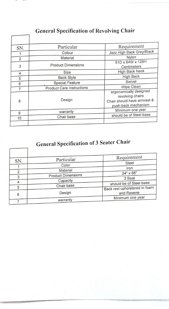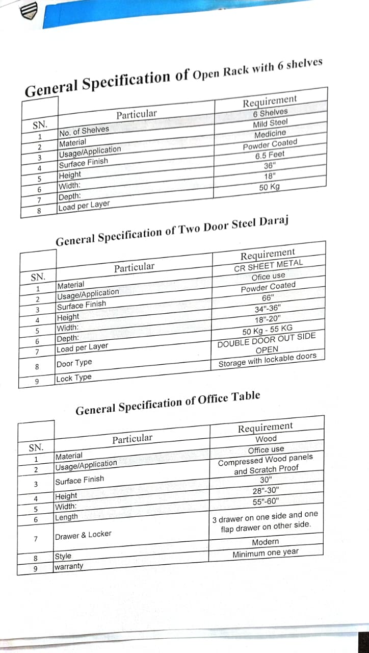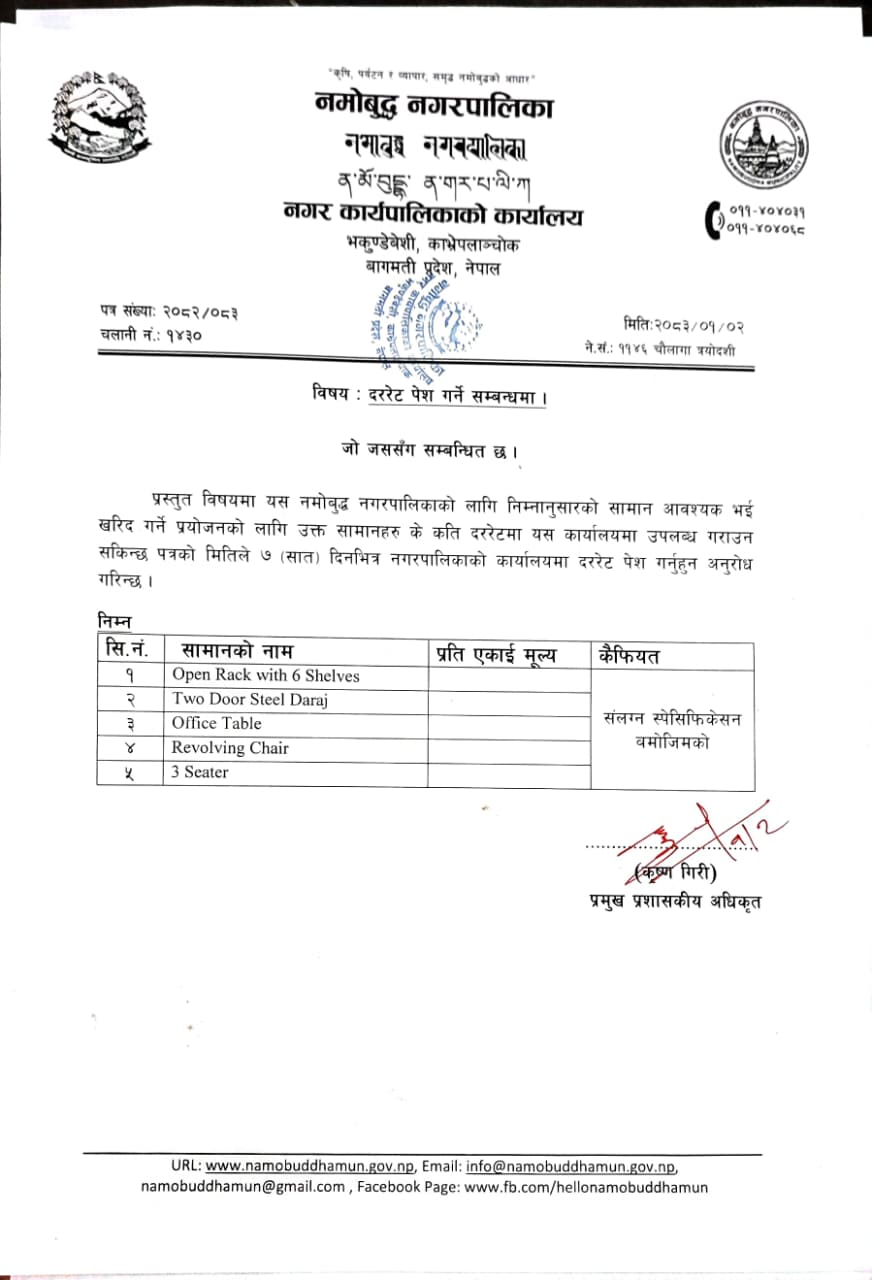 दररेट पेश गर्ने सम्बन्धमा (फर्निचर सामाग्रीहरु)