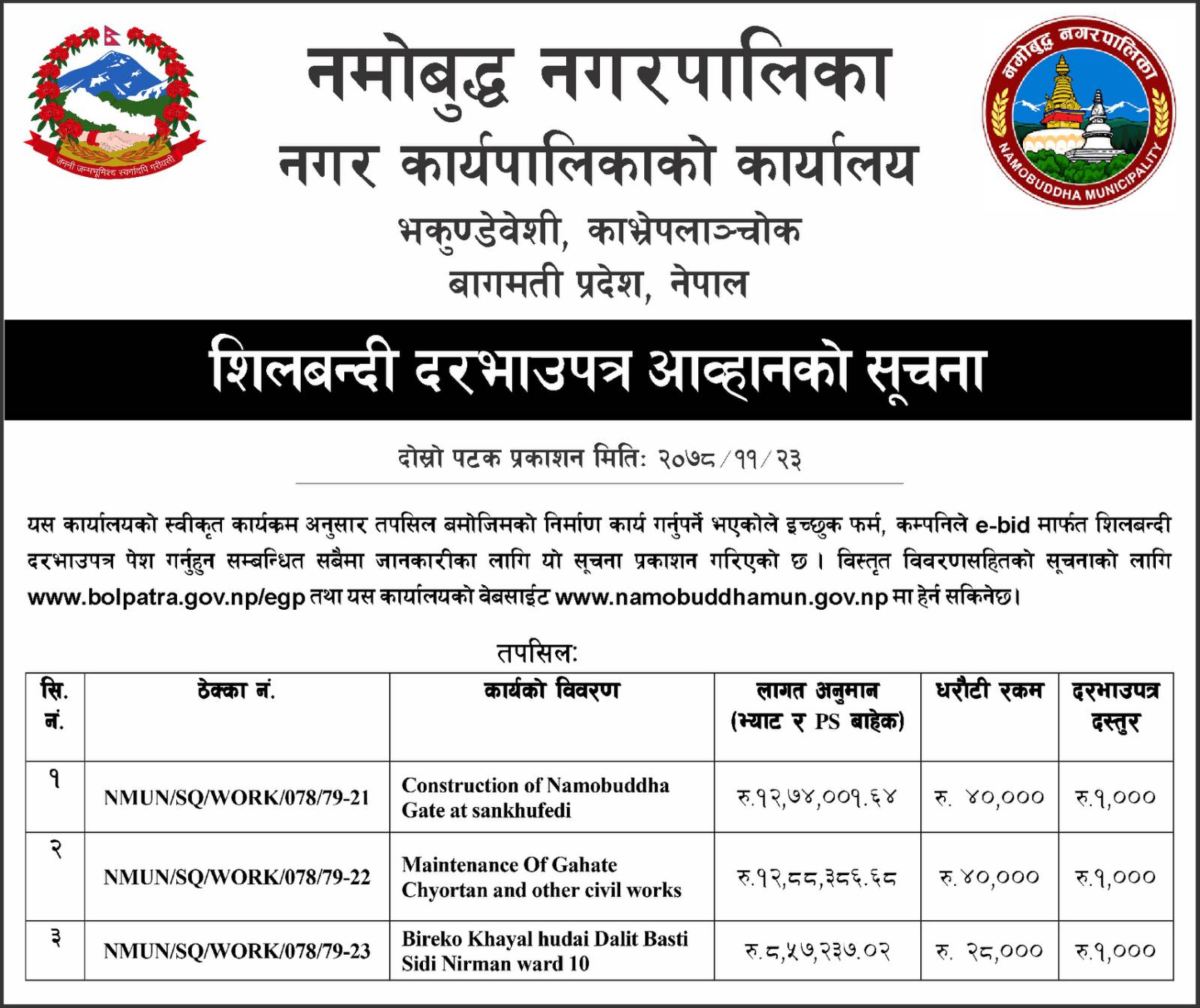 » शिलबन्दी दरभाउपत्र आव्हानकाे सूचना