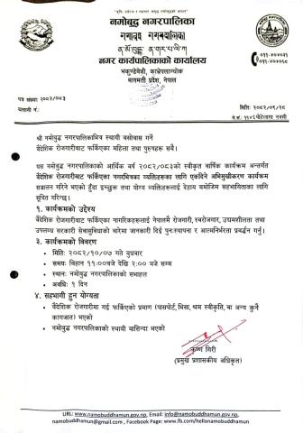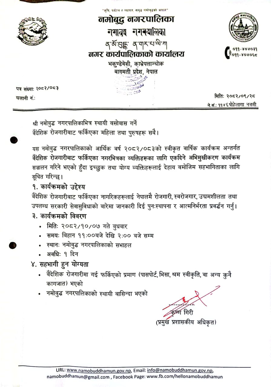 यस नमोबुद्ध नगरपालिकाको आर्थिक वर्ष २०८२/०८३ को स्वीकृत वार्षिक कार्यक्रम अन्तर्गत वैदेशिक रोजगारीबाट फर्किएका नगरभित्रका व्यक्तिहरूका लागि एकदिने अभिमुखीकरण कार्यक्रम सञ्चालन गरिने भएको हुँदा इच्छुक तथा योग्य व्यक्तिहरूलाई देहाय बमोजिम सहभागिताका लागि सूचित गरिन्छ।