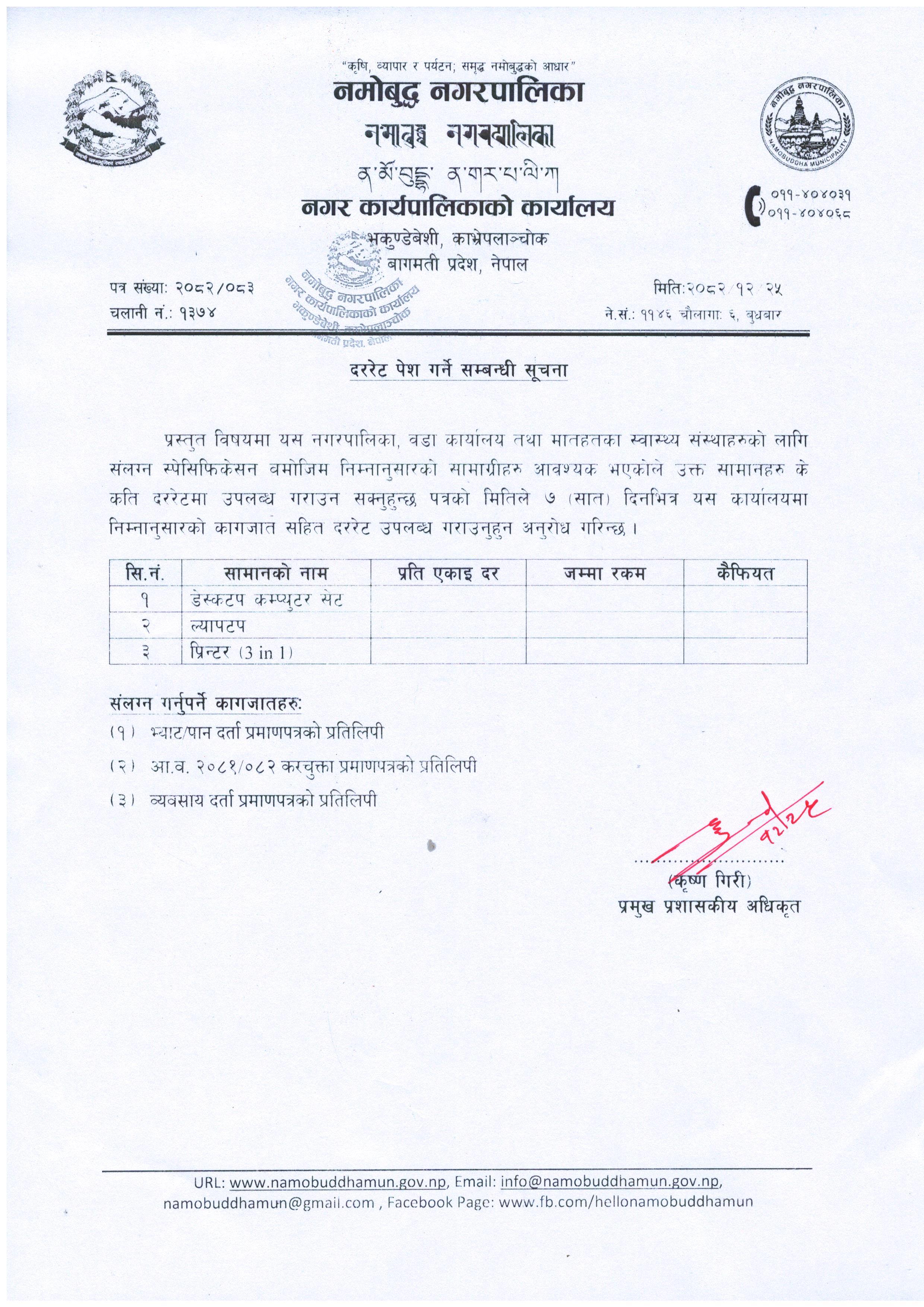 डेस्कटप कम्पयुटर, प्रिन्टर र ल्यापटप खरिद प्रयोजनार्थ दररेट पेश गर्ने सम्बन्धी सूचना
