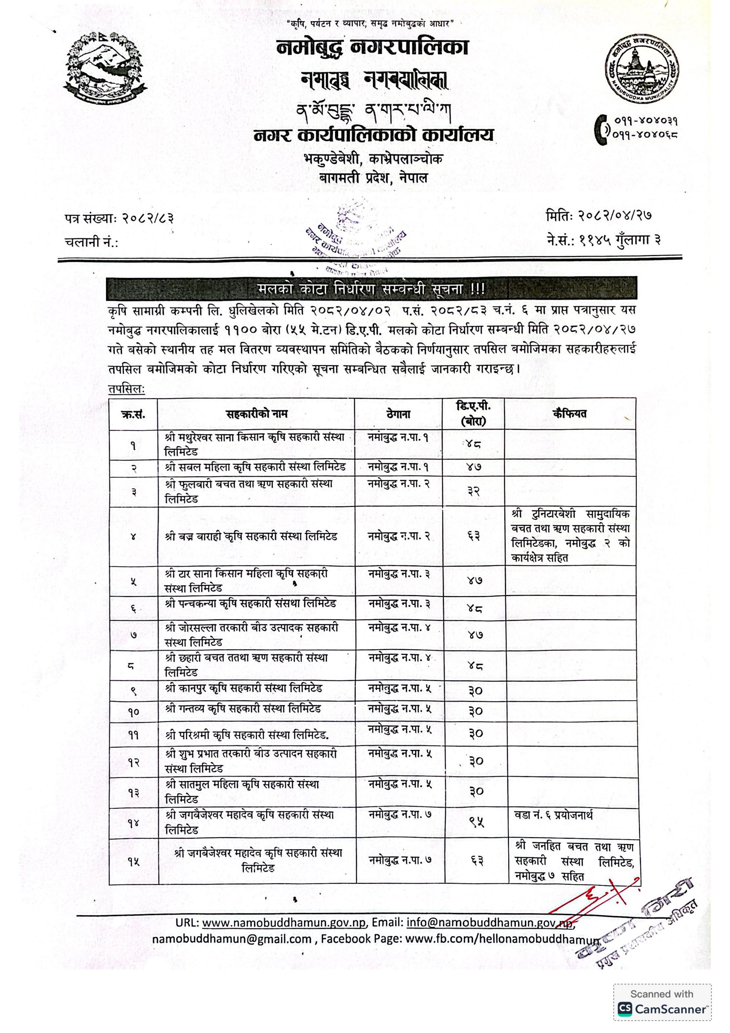 मलको कोटा निर्धारण सम्बन्धी सूचना !!!
