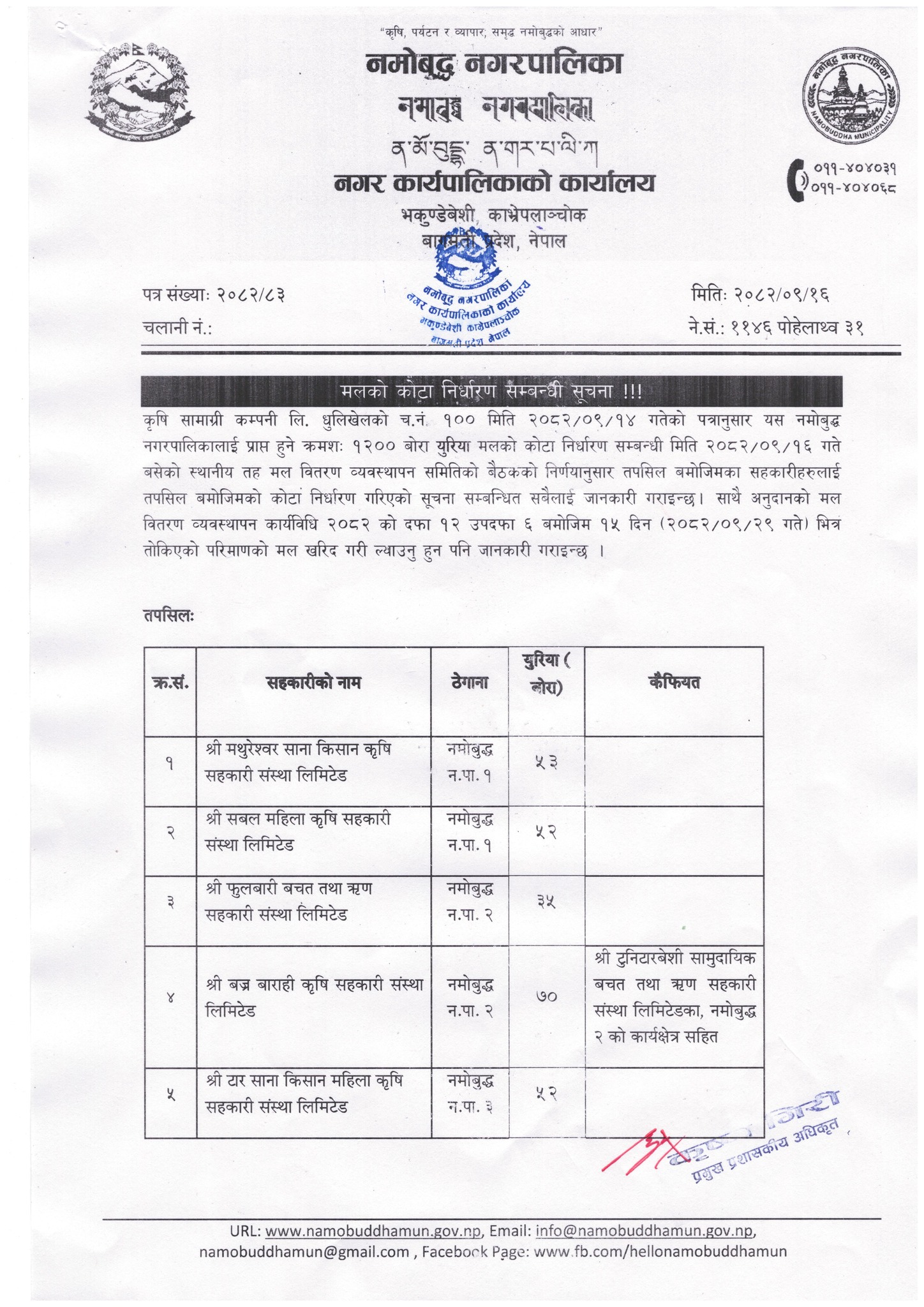 मलको कोटा निर्धारण सम्वन्धी नमोबुद्ध नगरपालिकाको सूचना !!!