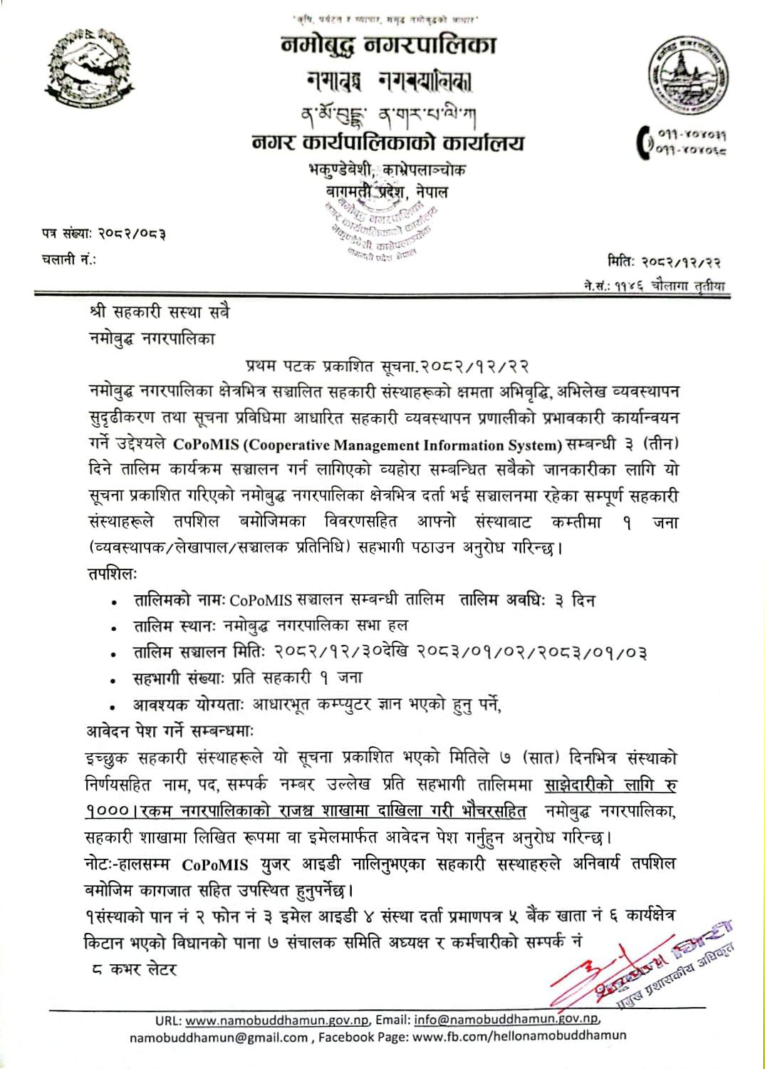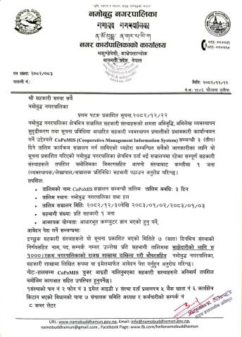 CoPoMIS (Cooperative Management Information System) सम्बन्धी ३ (तीन) दिने तालिम कार्यक्रम सञ्चालन गर्न लागिएको व्यहोरा सम्बन्धमा ।