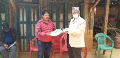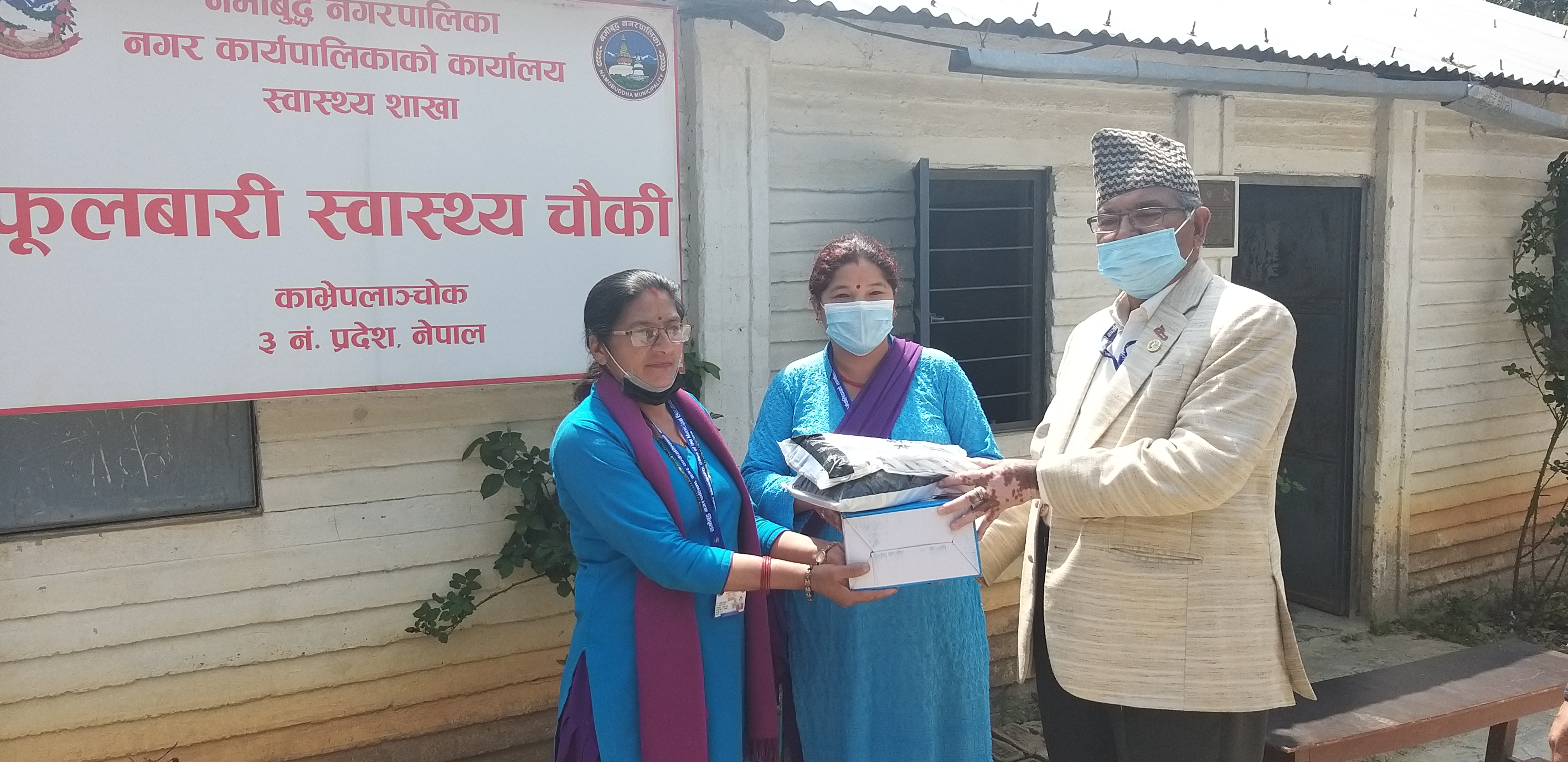 save the children मार्फत नाङ्गशाल एशाेसियसनबाट प्राप्त surgical mask, gloves, hand sanitizer लगायतका स्वास्थ्य सामग्रिहरु नगर प्रमुखद्धारा ११ वटै वडाका वडा अध्यक्ष मार्फत स्वास्थ्य संस्थाहरुमा वितरण गर्नुहुदै नगर प्रमुख